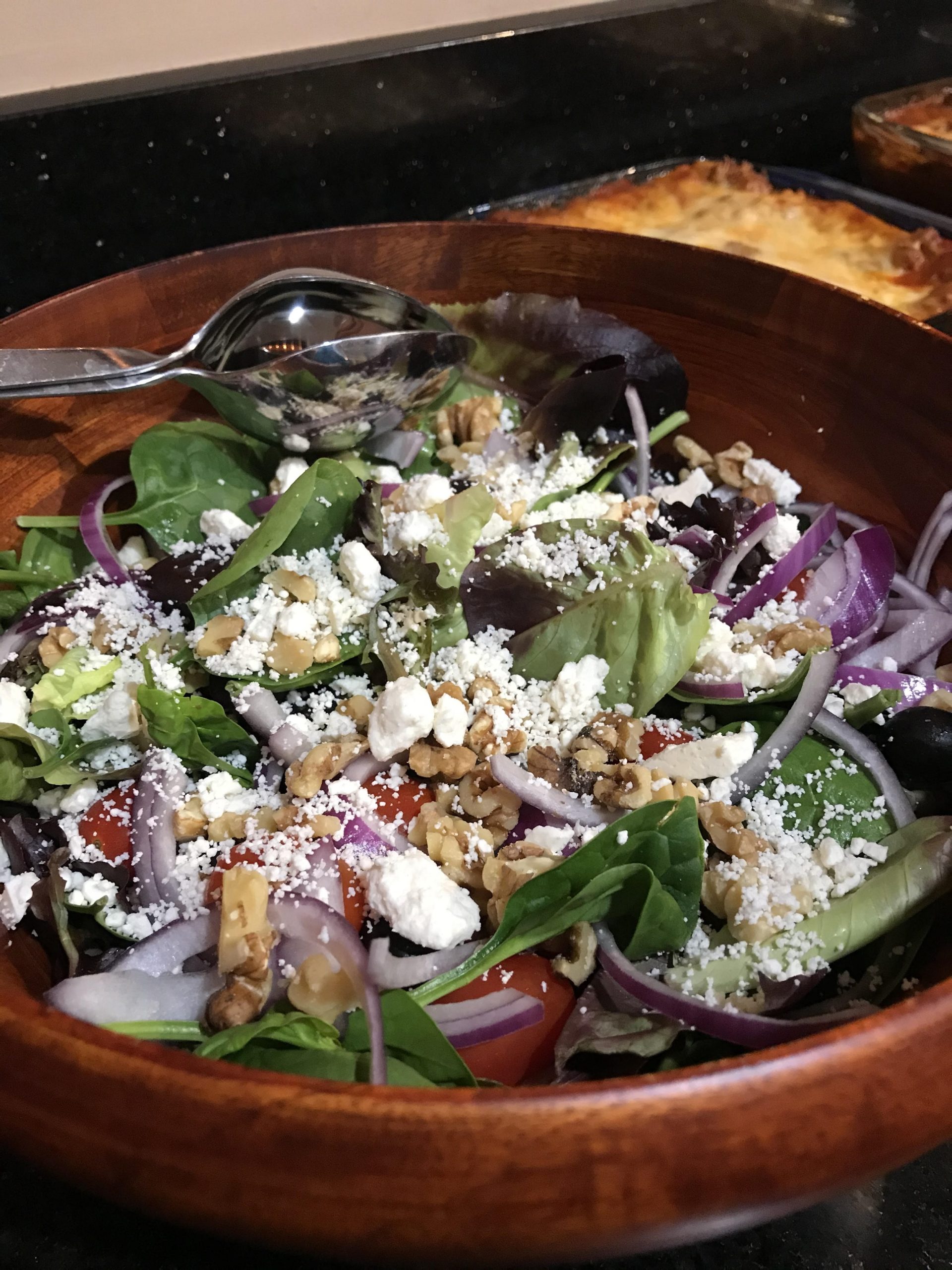 2. toss the spring mix in a salad bowl with half the walnuts, red onions, grape tomatoes, and feta cheese.